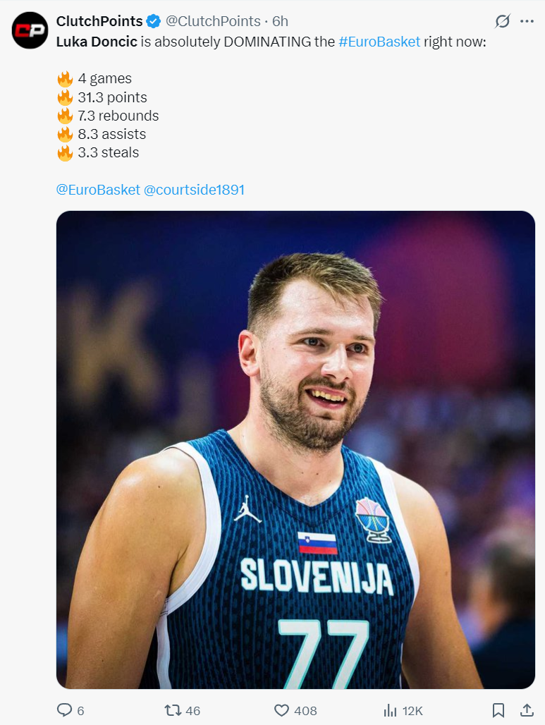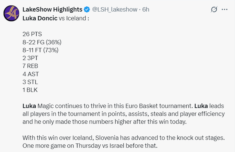 湖媒:东契奇延续欧洲杯的出色表现,他在本次大会中得分、篮板、助攻、抢断、效率都领跑全队,凭借对阵冰岛的胜利,斯洛文尼亚也成功晋级淘汰赛,他们小组赛还剩一场VS以色列。